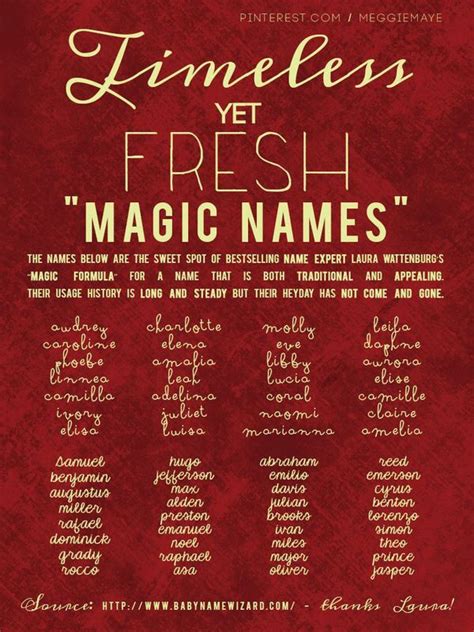 Magic Sounding Names - Baby girl names that mean magic. We’ve collected 100 spellbinding, magical baby names — 50 for girls and 50 for boys. These legendary monikers inspire awe, mystery, and intrigue, and can be used for babies of any gender. Are you tired of traditional names and hoping to find an enchanting choice for your son or daughter? You'll learn meanings, origins,.